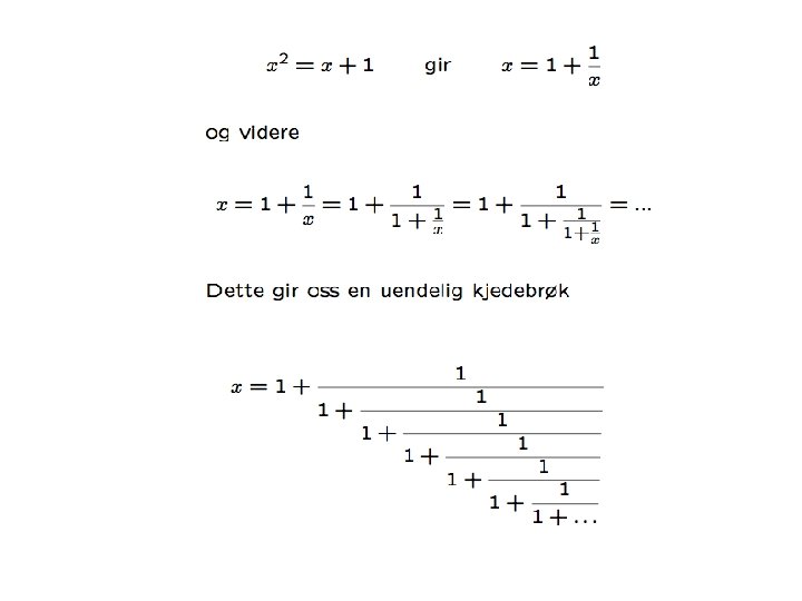 Kutter vi av denne får vi brøkene 1, 3/2, 5/3, 8/5, 13/8, . . . som gir oss Fibonacci-tallene 1, 2, 3, 5, 8, 13, . . . . (her lener vi oss på Pytagoras - alt er tall)