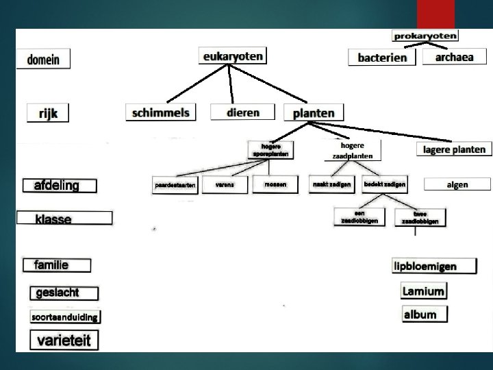 Naamgeving en indeling plantenrijk Wetenschappelijke naam binaire nomenclatuur afgeleid van indeling plantenrijk Bijvoorbeeld: Lamium album = soortnaam Lamium = geslachtsnaam album = soortaanduiding (betekent wit)