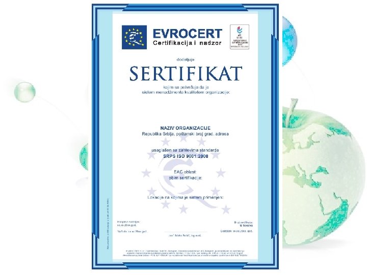 Sertifikacija i resertifikacija • Sprovode nezavisne sertifikacione kuće koje su akreditovane za tu delatnost od strane Akreditacionog tela Srbije - ATS i/ili Evropske kooperacije za akreditaciju - EA • Izdati sertifikat važi 3 godine • Obavezna je godišnja nadzorna provera, inače se sertifikat povlači. • Resertifikacija podrazumeva isti postupak kao i inicijalno ocenjivanje