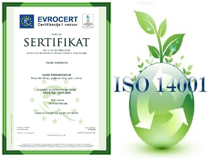 Sistem ekološkog menadžmenta – ISO 14000 • Sistem menadžmenta zaštite životne sredine javio se kao reakcija na neodgovorno ponašanje velikog broja kompanija i organizacija, oslikavajući urgentnu potrebu tržišta za očuvanjem životne sredine. • Implementacija Sistema ekološkog menadžmenta može se odnositi na čitavu kompaniju, jedan ogranak ili čak na samo jedan proces, a izbor uglavnom zavisi od potrebe kompanije.