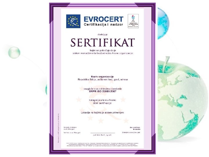 Primena Global Gap standarda • Ustanovljen od privatnih lica koja su napravila dobrovoljne standarde za sertifikaciju za sve poljoprivredne proizvde širom sveta. • Sertifikat pokriva procese koji ulaze u proizvodnju na farmi (npr. stočnu hranu ili sadnice), kao i sve radne aktivnosti na proizvodnji proizvoda sve dok finalni proizvod ne napusti farmu. • Uključuje kako godišnju inspekciju pri proizvodnji, tako i dodatne nenajavljene inspekcije. • Sastoji se od seta dokumenata koje je neophodno primeniti u proizvodnji: generalne odredbe, kontrolne tačke, usklađenost kriterijuma i kontrolnu listu