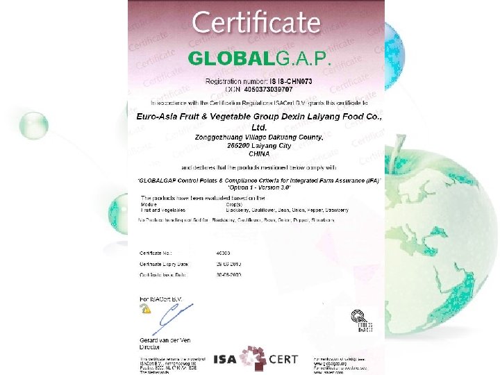 Global. Gap • Zahtevi potrošača da kupuju prirodne, ukusne i sveže proizvode, proizvedene na prirodan i zdrav način i to u procesu koji ne narušava životnu sredinu, sve su naglašeniji. • Global. GAP je sistem mera osiguranja kvaliteta namirnica tj. poljoprivrednih proizvoda od zasada do ulaska u fabričku preradu.