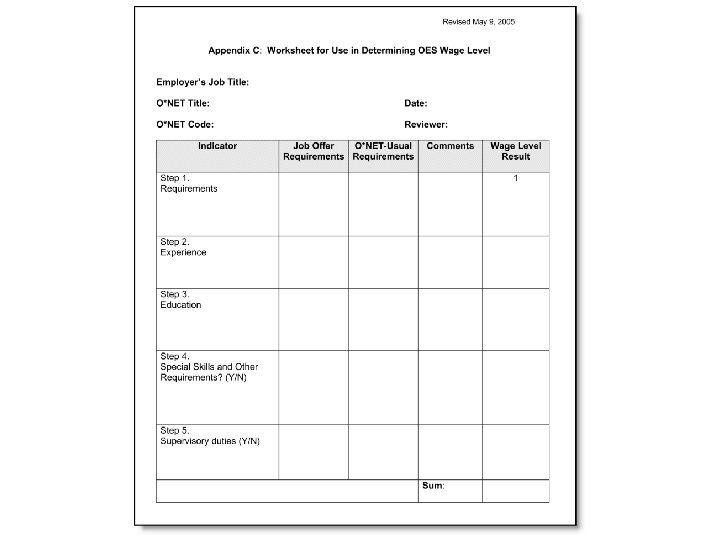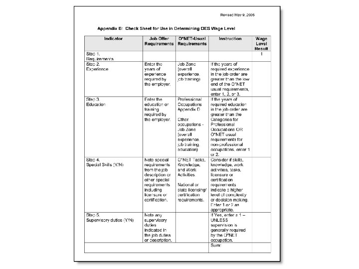 Determining the Prevailing Wage l STEP 1: List Job Offer Requirements l STEP 2: Compare Job Offer Experience requirements with Job Zone/SVP Range At low end of range, add 1 level l At high end of range, add 2 levels l Outside the range, add 3 levels l