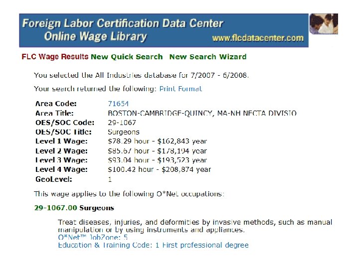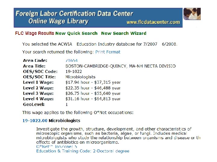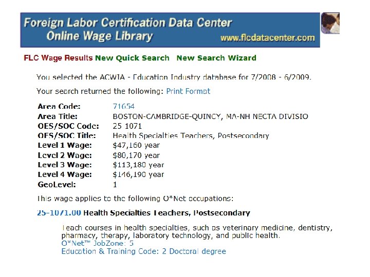 Prevailing Wage Lingo l Standard Occupational Classification – Occupational Information Network (SOC-O*NET or O*NET for short) l Specific Vocational Preparation (SVP) (used under the old Dictionary of Occupational Titles) l Job Zones (used under the current O*NET system)