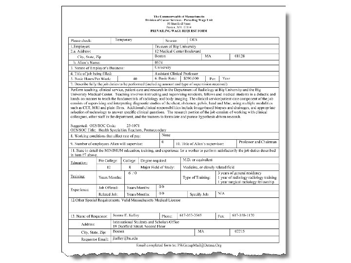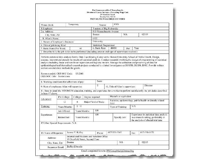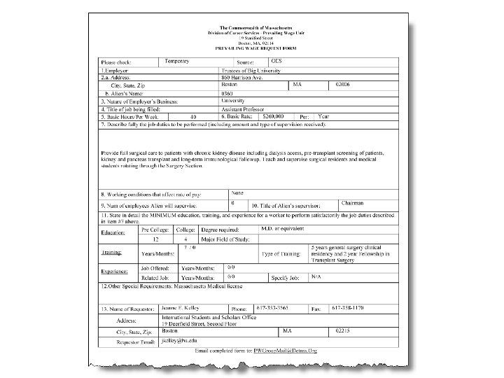 Determining the Prevailing Wage l STEP 3: Compare Job Offer Educational Requirements with DOL Appendix l Add a level for each level of education higher than the “usual” degree l STEPS 4 – 6: Any special skills, licensure/certification, or supervisory duties? If yes, add a level