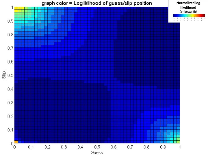 Grid-search Procedure • These parameters are iterated in intervals of 0. 02 • 1 / 0. 02 + 1 = 51, 51*51 = 2601 total iterations • EM log likelihood • Higher = better fit to data Guess. T Slip. T Guess. I Slip. I Guess. L Slip. L Error LLstart LLend 0. 14 0. 09 0. 00 0. 1150 -1508 0. 14 0. 09 0. 00 0. 02 0. 23 0. 14 0. 1390 -344 -251 0. 14 0. 09 0. 00 0. 04 0. 23 0. 14 0. 1390 -309 -251 … … … … … 0. 14 0. 09 1. 00 0. 8850 -1645 • Grid-search run in intervals of 0. 02