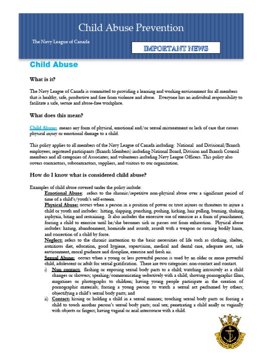 Harassment / Workplace Violence and Child Abuse Prevention The Navy League of Canada is committed to providing a learning and working environment for all persons that is healthy, safe and free from harassment, discrimination, violence and child abuse. Mandatory Training The Navy League of Canada requires all members of the Navy League of Canada to conduct themselves in a manner, which promotes and protects the best interests and well-being of cadets, staff and volunteers. Everyone within the organization has an individual responsibility to contribute to creating and maintaining a respectful workplace and must be dedicated to preventing harassment, discrimination and to facilitate a safe, secure and violence and child abuse free organization. Who must complete this Training? Compliance to the NL 22 is mandatory to all members of the Navy League of Canada including but not limited to the following: ØNational and Divisional/Branch employees; ØNavy League Registered Participants (Branch Members) ØNational Board, Division and Branch Council members ØAll Navy League volunteers including Navy League Officers Course Outline The Navy League - NL 22 Harassment / Workplace Violence and Child Abuse Prevention training is completed in two stages. 1) Pre-course assignment Review of Navy League - NL 22 Policy Review of the following pages. 2) Classroom Training. Certification All Navy League members who have completed the NL 22 training will receive a certificate of completion that will be valid for a period of 3 years at which time refresher training must be completed.