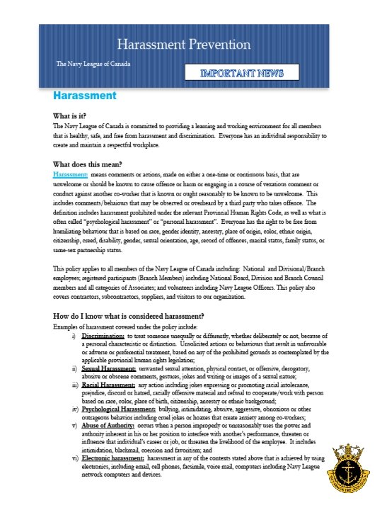 Navy League of Canada VID Harassment Workplace Violence