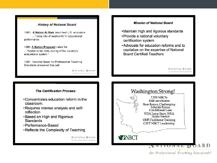 Purpose 1. Create systems of support through the NBCT Networks that can bring National Board to scale within each context. • Create the vision of the National Board program focused on instructional improvement and student learning. • Design a system that utilizes high quality professional learning. 2. Share resources and best practices across the NBCT Network systems. • Continue to use the Facebook NBCT Networks Group site to communicate. • Utilize a google folder system to share resources connected to this webinar series. 3. Provide feedback to the National Board regarding system development. . • Provides inputs as we develop plans for future CSP, NBCT Leadership and NBCT Network support.