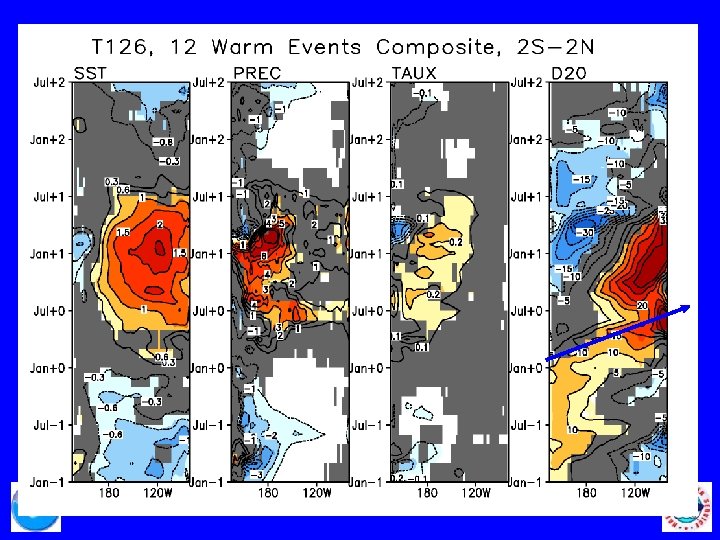 Lag • D 20 anom. in T 62 propagates from the western Pacific to eastern Pacific, similar to obs. , while T 126 anom. propagates little. • T 62 has too strong D 20 precursor. • T 62 has too strong amplitude in the Indian Ocean.