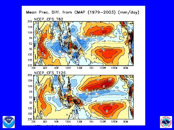 • Amplitude of prec. anom. in T 62 and T 126 (2. 5 mm/day) is similar to obs except there are two maximum centers located to north and south of the equator. • Spatial structure of prec. anom. is similar to obs except convection south of equator extended too far eastward, subsidence over Indonesian continent is too weak and subsidence to north of ITCZ too strong.