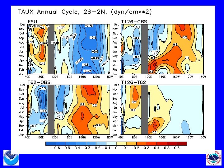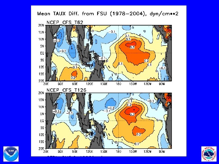 • Amplitude of westerly anom. in T 62 (1. 2 dyn/cm 2) and T 126 (0. 9 dyn/cm 2) is smaller than that of obs (1. 5 dyn/cm 2), but easterly anom. to north of westerly center is too strong. • Spatial structure of zonal wind stress anom. is similar to that of obs except its meridional width is too narrow.