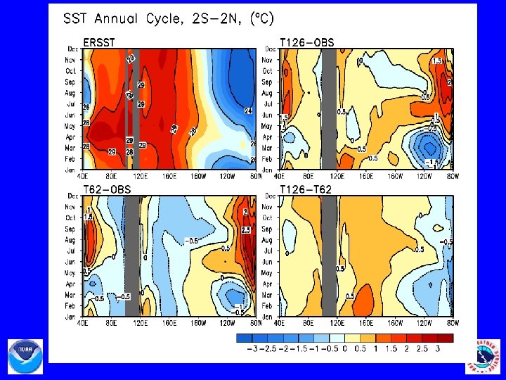 Summary • T 62 and T 126 have similar mean biases – Negative SST biases (-1 o. C) in north-western Pacific, positive biases (2 o. C) in south-eastern Pacific – Double ITCZ and too little prec. in the equatorial western Pacific • T 62 and T 126 have different biases in annual cycle on the equator – SST in the eastern Pacific peaks in May in T 62 and in June in T 126 – T 126 has eastward propagating westerly and rain band in early spring in the far western Pacific – Both T 62 and T 126 have too deep thermocline in June due to excessive westerly in the far western Pacific in spring • T 62 and T 126 have similar phase-locking of warm events to end of year but T 62 has onsets in Dec-1 – Apr+0 and T 126 has onsets in Jan+0 – Aug+0.