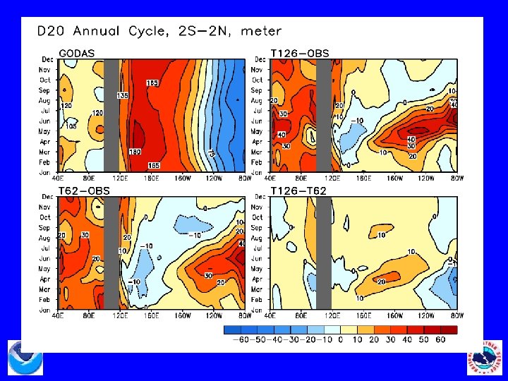 • Amplitude of positive D 20 anom. in T 62 (20 meter) and T 126 (20 meter) is a little larger than that of obs (15 meter). • Positive center in the eastern Pacific is too equatorially confined, and the negative center in the north-western Pacific is located too close to the equator, and extended too far eastward.