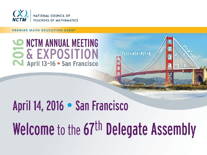 NCTM Delegate Assembly Update Diane Briars, President National Council of Teachers of Mathematics NCTM Delegate Assembly NCTM 2016 Annual Meeting & Exposition San Francisco