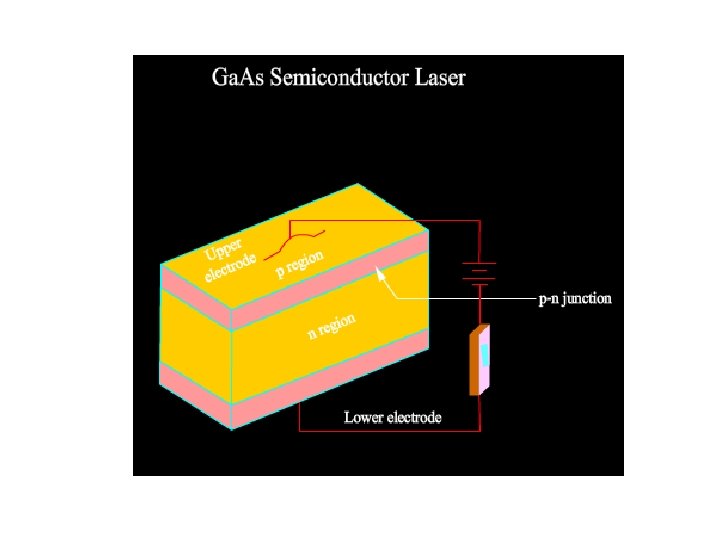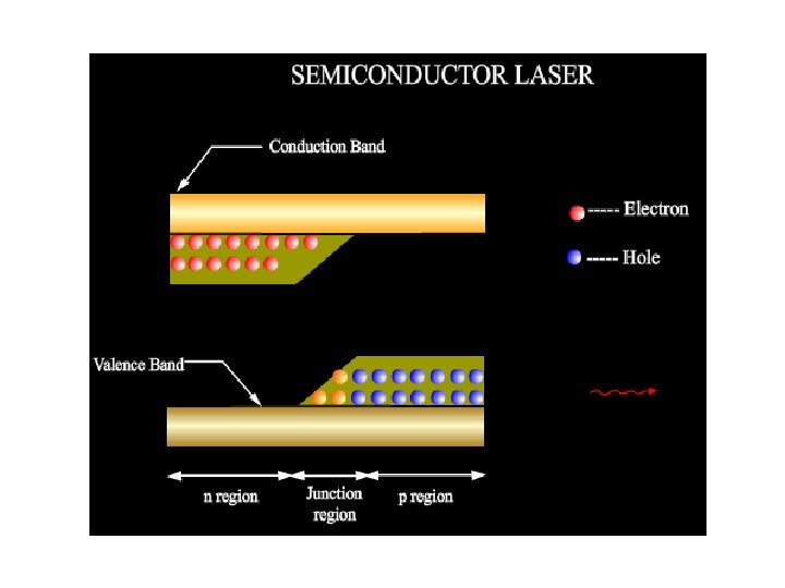 HOMOJUNCTION SEMICONDUCTOR LASER (Ga-As Laser) Principle • The electron in the conduction band combines with a hole in the valence band the recombination produces radiant energy. This photon induces another electron in the CB to combine with a hole in the VB and thereby stimulate the emission of another photon. Type : Homojunction Semiconductor laser Active Medium : P – N junction Active Centre : Recombination of electrons and holes Pumping Method : Direct Pumping Optical Resonator : Polished junction of diode Power Output : 1 m. W Nature of Output : Continuous or pulsed Wavelength Emitted : 8400 – 8600 Angstrom Units