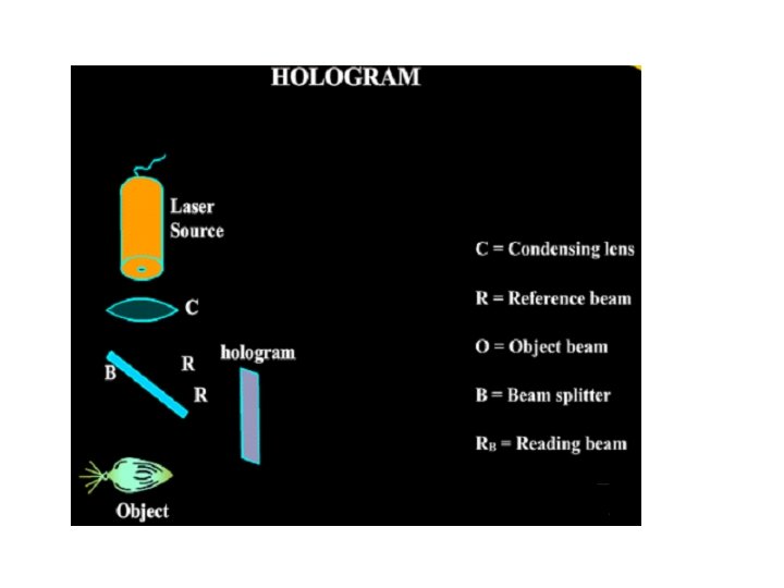 Principle Two beams (object beam and reference beam) are superimposed on a holographic plate to form an image called a hologram.