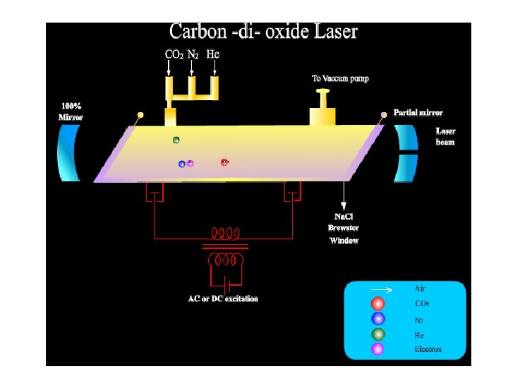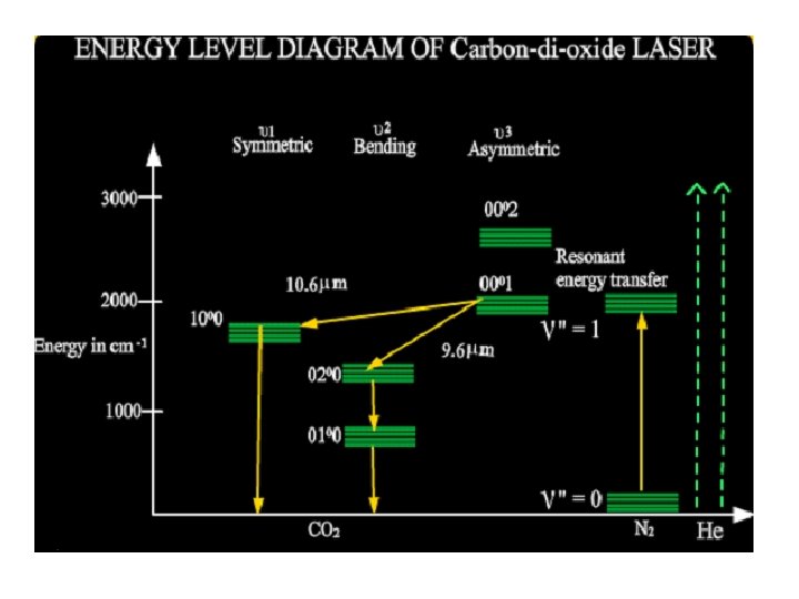 Carbon Di Oxide LASER Principle The transition between the rotational and vibrational energy levels lends to the construction of a molecular gas laser. Nitrogen atoms are raised to the excited state which in turn deliver energy to the CO 2 atoms whose energy levels are close to it. Transition takes place between the energy levels of CO 2 atoms and the laser beam is emitted. Type : Molecular gas laser Active Medium : Mixture of CO 2, N 2, He or H 2 O vapour Active Centre : CO 2 Pumping Method : Electric Discharge Method Optical Resonator : Gold mirror or Si mirror coated with Al Power Output : 10 k. W Nature of Output : Continuous or pulsed Wavelength Emitted : 9. 6 μm or 10. 6 μm