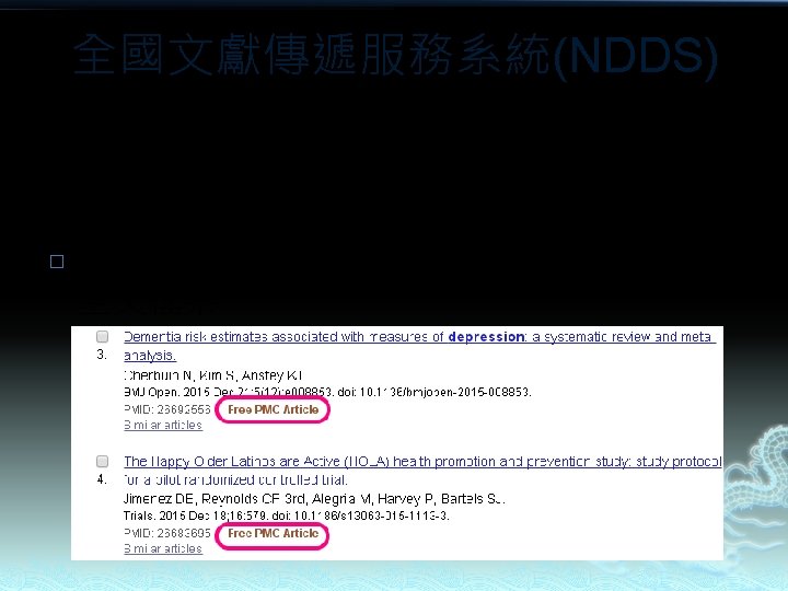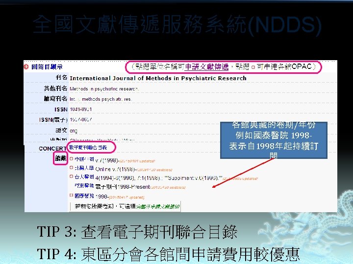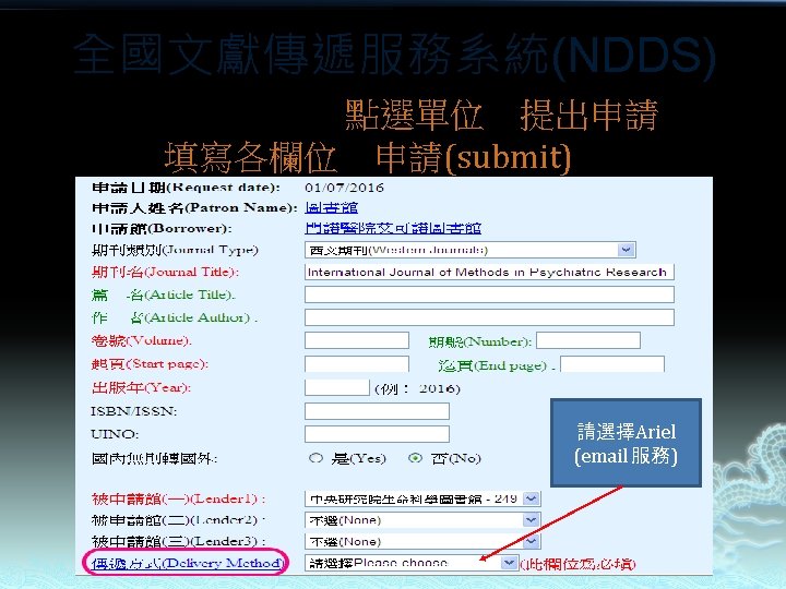 全國文獻傳遞服務系統(NDDS) 空白申請單使用範例: From appearance to essence: 10 years review of atypical amniotic fluid embolism Archives of Gynecology and Obstetrics � Epub ahead of print 2015 電子期刊聯合目錄-注意收錄年限及附註項是否有限制