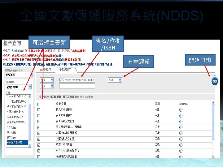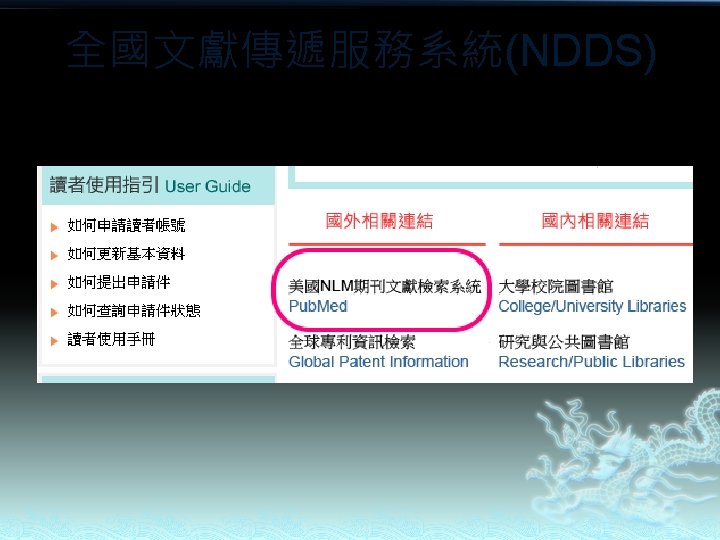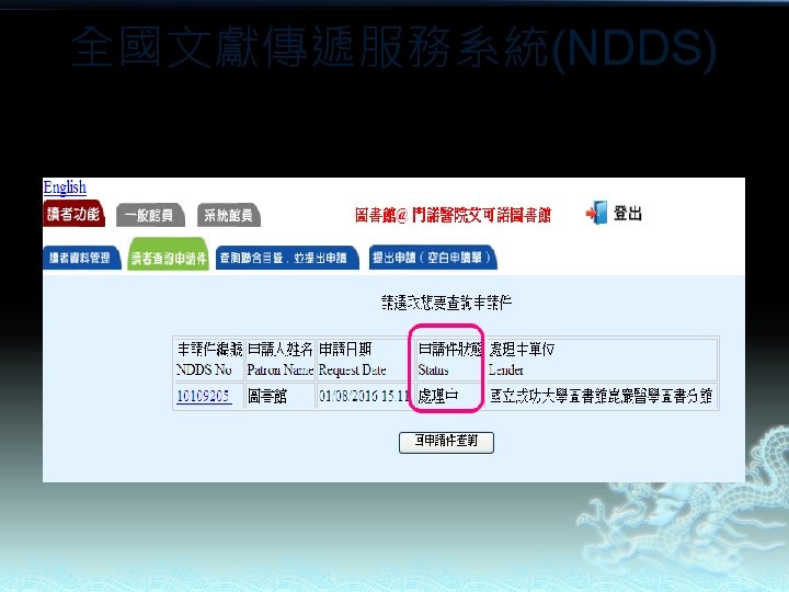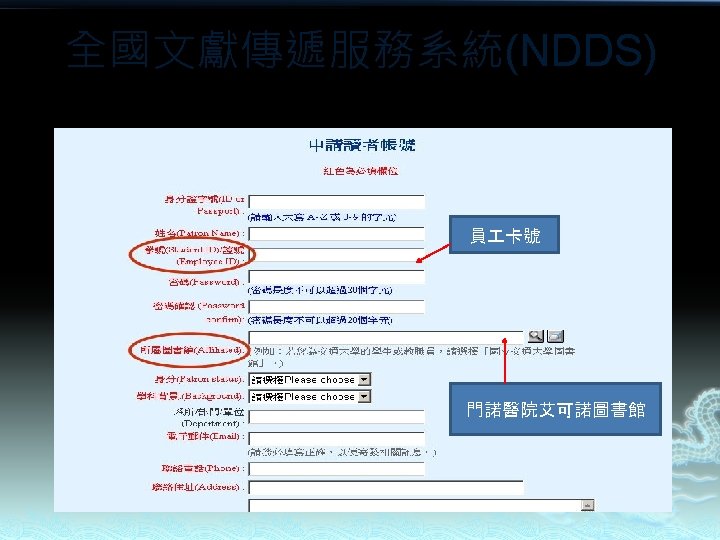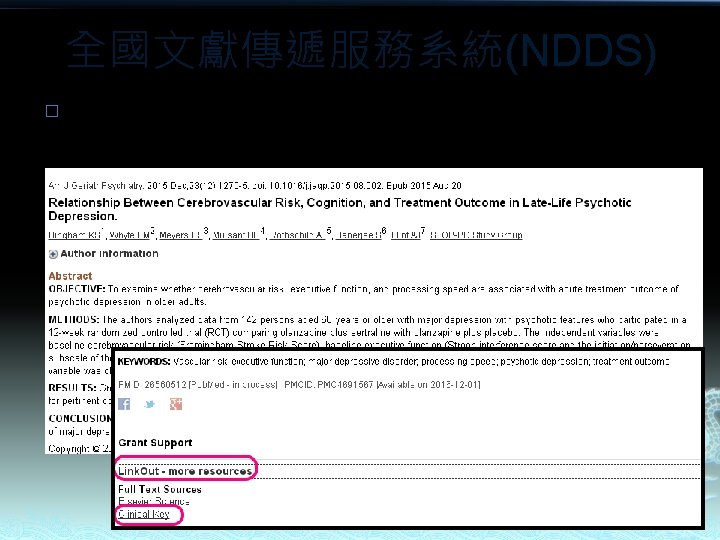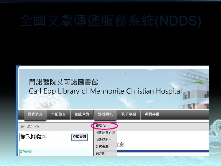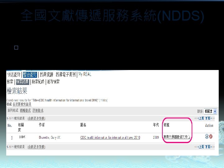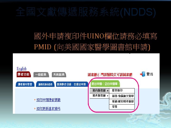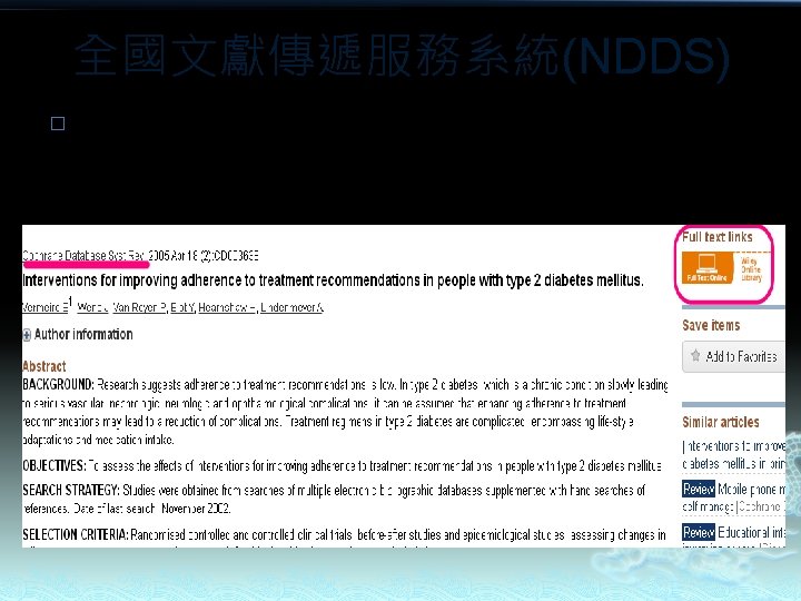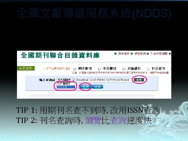 全國文獻傳遞服務系統(NDDS) 空白申請單使用範例: From appearance to essence: 10 years review of atypical amniotic fluid embolism Archives of Gynecology and Obstetrics � Epub ahead of print 2015 電子期刊聯合目錄-點擊刊名查看有哪些館訂閱此資料庫