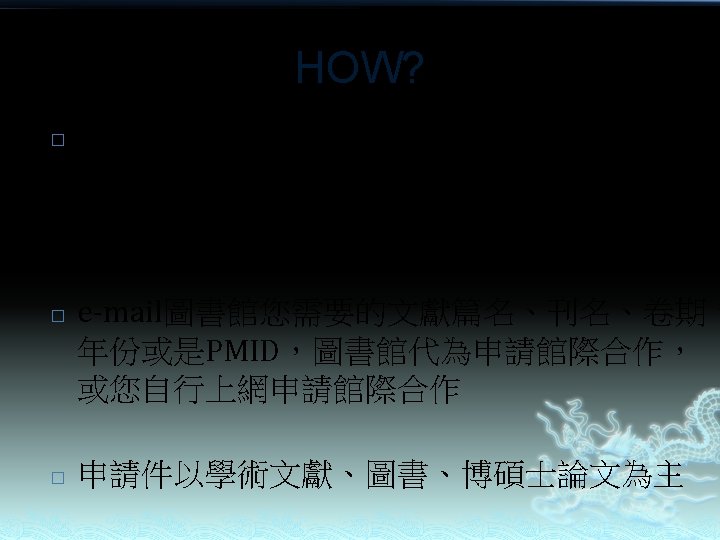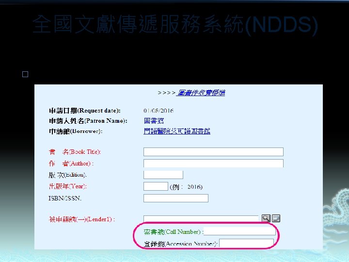 全國文獻傳遞服務系統(NDDS) 空白申請單使用範例: From appearance to essence: 10 years review of atypical amniotic fluid embolism Archives of Gynecology and Obstetrics � 期刊聯合目錄查詢 Epub ahead of print 2015