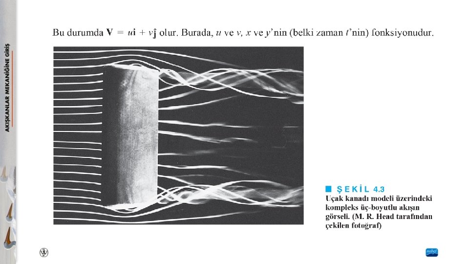 4. 1. 2 Bir, İki ve Üç-Boyutlu Akışlar Gerçekte hemen bütün akışlarda, hız alanının üç hız bileşeni (örneğin u, v ve w) vardır. Çok sayıda akış için, üç-boyutlu akış karakteristikleri, akışın oluşturduğu fiziksel etkiler açısından önemlidir. Şekil 4. 3’te verilen uçak kanadı üzerindeki akışın fotoğrafı incelenerek akışın üç-boyutlu yapısı hissedilebilir. Bazı akışlarda, hız bileşenlerinden birinin etkisi diğer bileşenlere göre (bazı açılardan) küçük olabilir. Bu tür akışlarda, küçük hız bileşeni ihmal edilebilir ve akış iki-boyutlu kabul edilir.