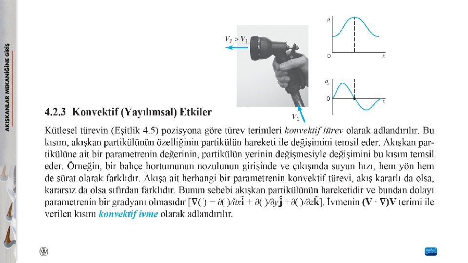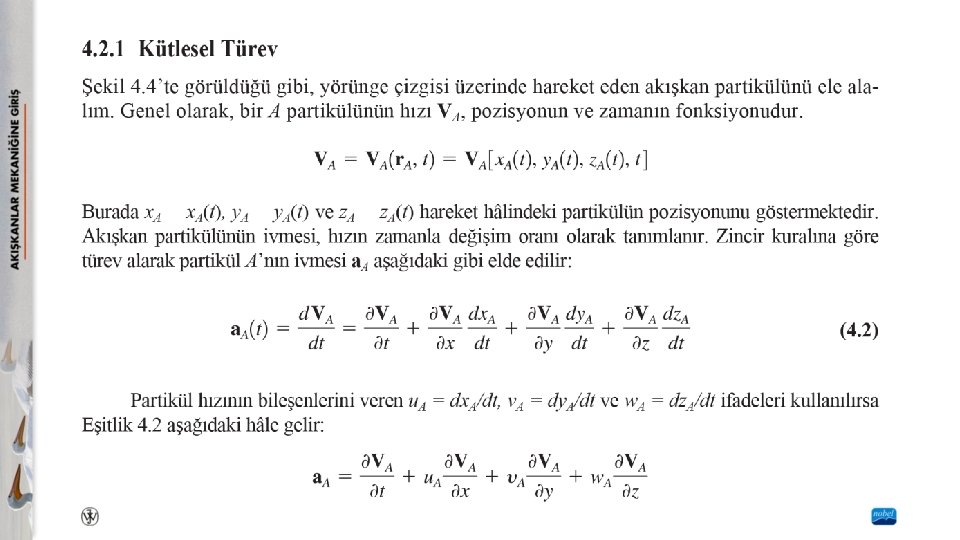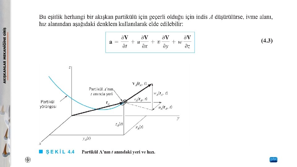 İvme Alanı Newton’un ikici kanununu (F = ma) uygulayabilmek için akışkan partikülünün ivmesinin uygun bir şekilde ifade edilmesi gerekir. Akışkanlar mekaniğinde çok az kullanılan Lagrangian metodunda, her bir akışkan partikülünün ivmesi katı cisim dinamiğinde olduğu gibi, a = a(t) olarak tanımlanır. Eulerian metodunda, ivme alanı zamanın ve pozisyonun fonksiyonu olarak tanımlanır. Bu tanımlamada herhangi bir akışkan partikülü takip edilmez. Bu yaklaşım, her bir partikülün hızını tanımlamak yerine hız alanının V = V(x, y, z, t) ile tanımlanmasına benzer.