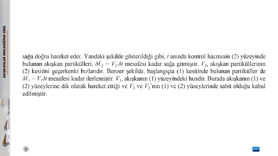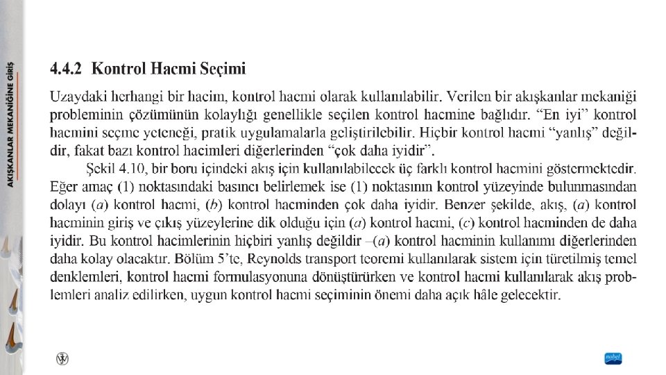 Kontrol Hacmi ve Sistem Tanımları Bir akışkanın davranışı, temel fizik kanunlarına bağlıdır. Bu temel kanunlar uygun matematiksel denklemlerle ifade edilebilir. Kütlenin korunumu kanunu, Newton’un hareket kanunun ve termodinamik kanunlarının uygulaması akışkanlar mekaniği analizlerinin temelini oluşturur. Sistem ve kontrol hacmi yaklaşımları başta olmak üzere, bu temel kanunlar bir akışkana değişik yöntemlerle uygulanabilir. Sistem, kütlesi sabit olan seçilmiş madde olarak tanımlanır. Sistem içinde her zaman aynı atomlar veya akışkan partikülleri bulunur. Bu sabit kütledeki madde hareket edebilir, akabilir ve çevresi ile etkileşim hâlinde olabilir. Kontrol hacmi, uzayda seçilmiş bir hacim (kütleden bağımsız geometrik bir varlık) olarak tanımlanır. Kontrol hacminin içinden akışkan akarak geçebilir.
