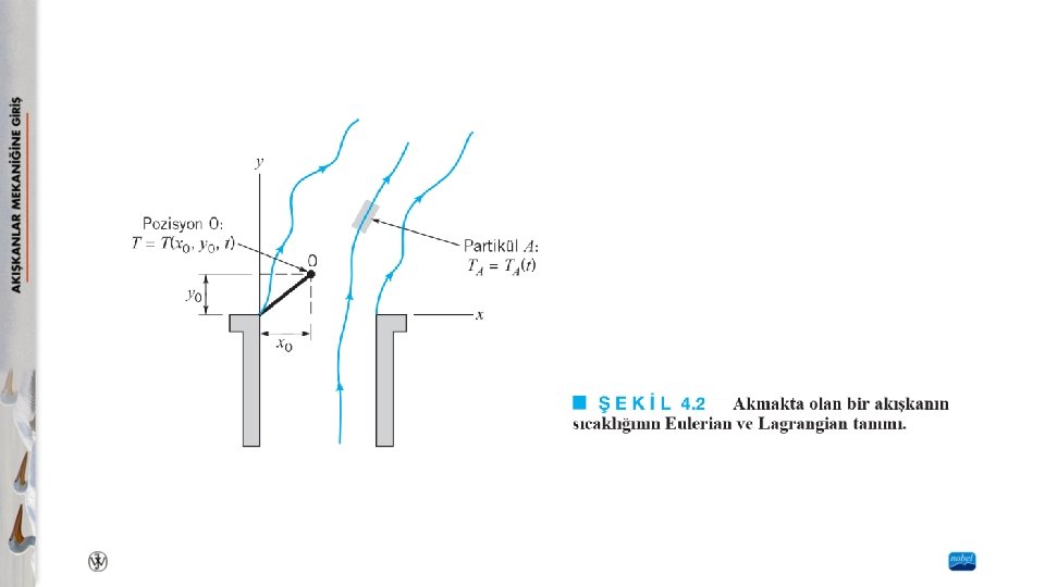 4. 1. 1 Eulerian ve Lagrangian Akış Tanımları Akışkanlar mekaniği problemlerini analiz etmek için iki genel yaklaşım vardır. Birincisi Eulerian metottur ve daha önce açıklandığı gibi bu metot alan kavramını kullanır. Bu yaklaşımda, akışkan hareketi, gerekli özellikler (basınç, yoğunluk, hız vb. ) pozisyonun ve zamanın fonksiyonu olarak ifade edilerek tanımlanır. Bu metotla, akışkan partikülleri akış alanı içerisindeki sabit noktalardan geçerken bu noktalarda neler olduğunu belirleyerek akışla ilgili bilgi elde ederiz. İkinci metot, Lagrangian metodu olarak adlandırılır. Bu metot, akmakta olan akışkan partiküllerinin tek takibini kapsar. Partiküllerin akışın özelliklerini nasıl değiştirdiği zamanın fonksiyonu olarak belirlenir. Bunun için, hareket hâlindeki akışkan partikülleri “etiketlenir” ve özellikleri belirlenir.