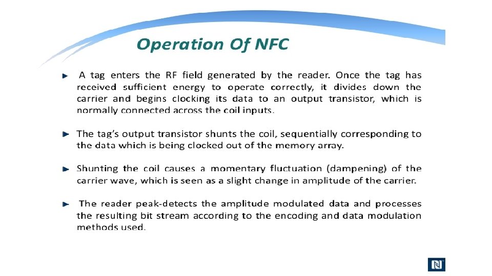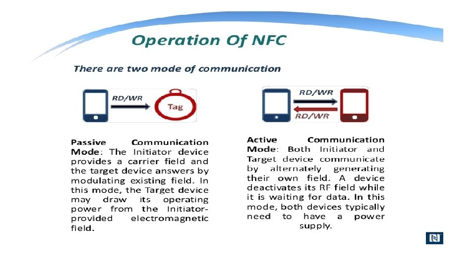 Active and Passive NFC Devices Active NFC device usually a microcontroller based like a NFC enabled smartphone, would not only be able to collect information from NFC tags, but it would also be able to exchange information with other compatible phones or devices and could even alter the information on the NFC tag if authorized to make such changes. NFC reader continuously emits RF carrier signals and keeps observing the received RF signals for data. A passive device, such as an NFC tag, contains information that other devices can read but does not read any information itself. NFC tag does not have its own power source. It absorbs energy emitted by the reader(phone) and starts sending modulated information when sufficient energy is acquired from the RF field generated by the reader. Data modulation (0 s and 1 s) is accomplished by either direct modulation or FSK or Phase modulation. • Operation: Active device generates the RF field and the passive device uses the field to power itself and communicate.