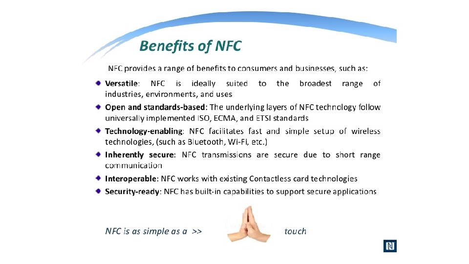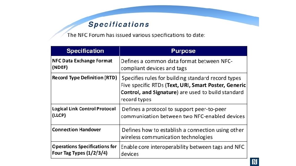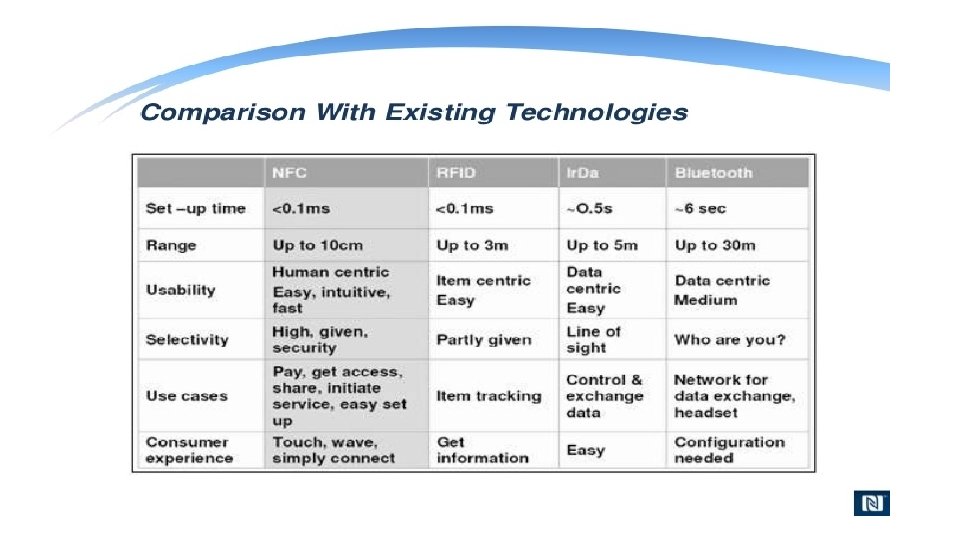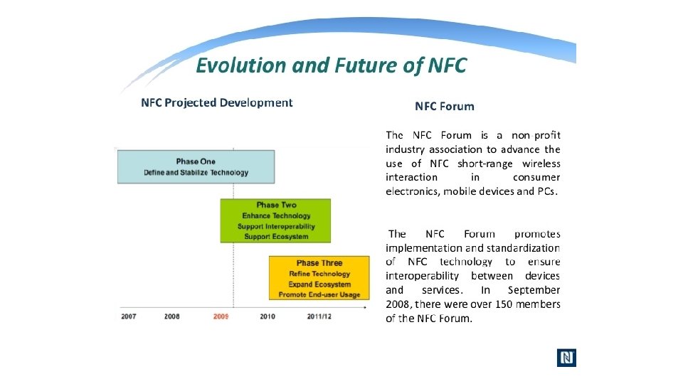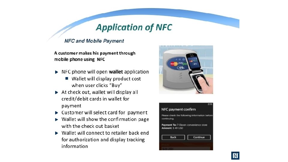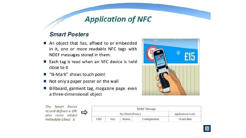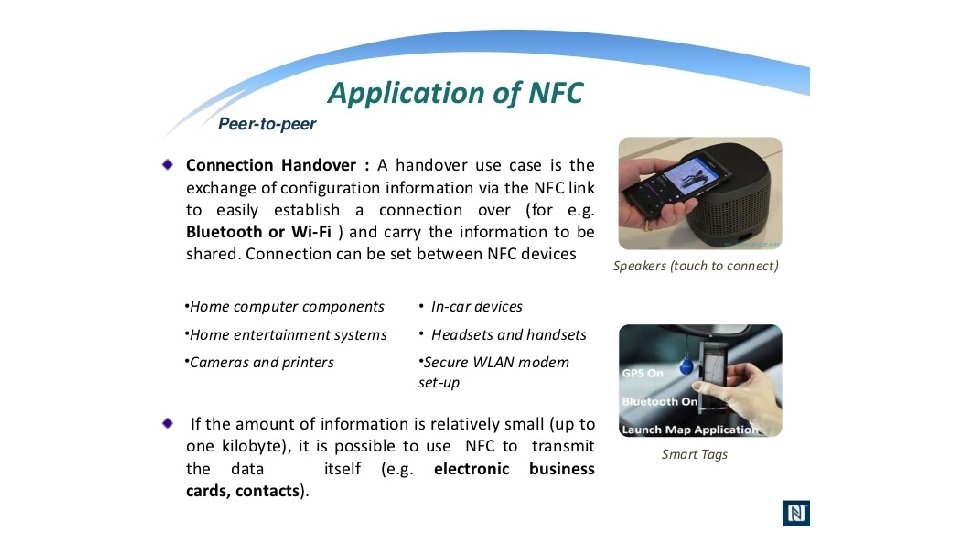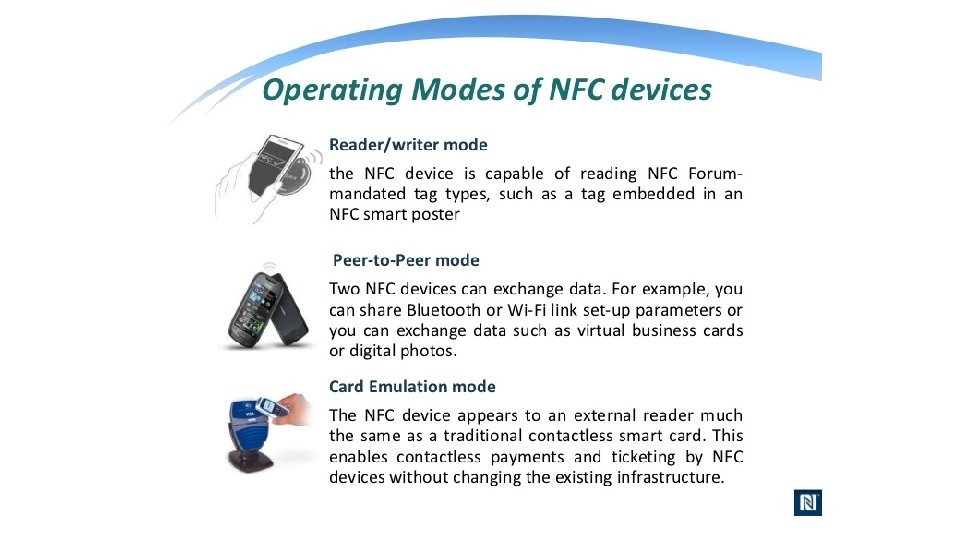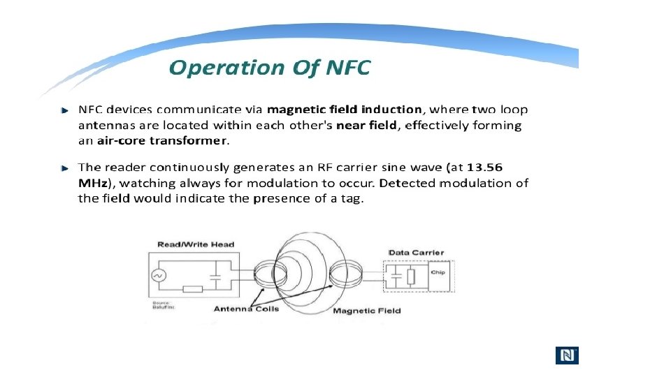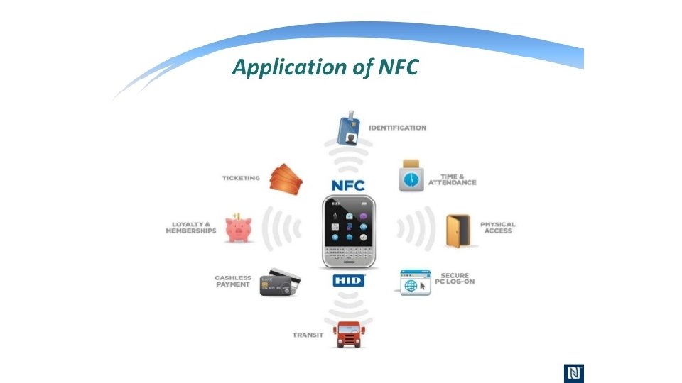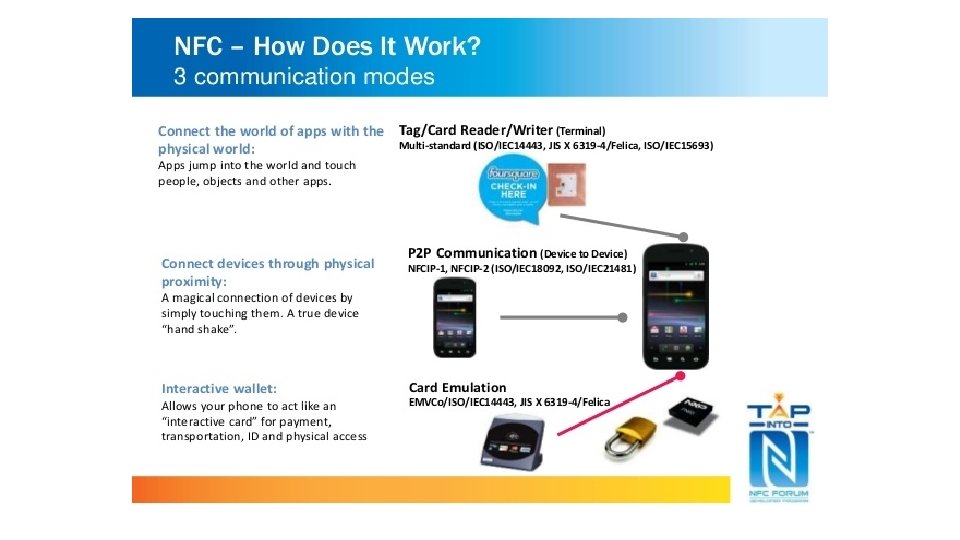 What is NFC? • NFC is an offshoot of RFID with the exception that NFC is designed for use by devices within close proximity to each other. • NFC is a short range high frequency wireless technology that carry secure two-way interactions between electronic devices. • NFC utilizes electromagnetic radio fields while technologies such as Bluetooth and Wi-Fi focus on radio transmissions instead. • NFC provides contact or contactless communication in a proximity of 1 – 4 centimeters and up to 10 centimeters. • NFC is mainly aimed for mobile or handheld devices. • NFC allows communication between: • Two powered (active) devices • Powered and non self-powered (passive) devices. • NFC offers the ultimate in security and convenience, and makes new interactions possible. • NFC combines the interface of a smartcard and a reader into a single device that allows two-way communication between endpoints, where RFID system was one-way only. • NFC devices operate at 13. 56 MHz, with a bandwidth 14 k. Hz. • NFC supports data rates: 106, 212 and 424 Kbits/s • For two devices to communicate using NFC, one device must have an NFC reader/writer and one must have an NFC Tag.