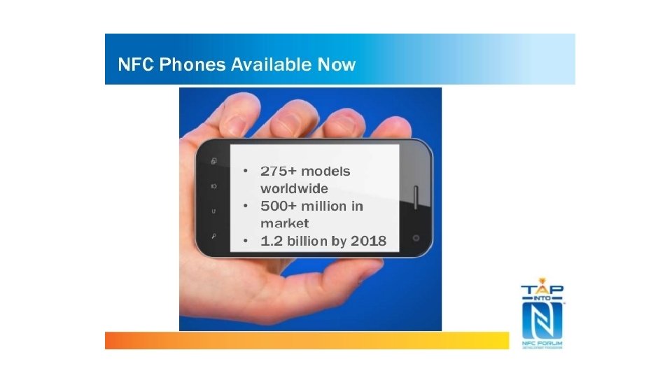 NFC Time Line Year Event 1983 The first patent to be associated with RFID was granted to Charles Walton 2002 NXP Semiconductors and Sony co-invent NFC 2004 Nokia, Phillips and Sony established the NFC forum 2006 Initial specifications for NFC Forum Tags and “Smart Poster” records 2006 Nokia launches the first NFC phone (Nokia 6131) 2009 NFC Forum releases Peer-to-Peer standards 2010 Samsung, Nexus 5: First Android NFC phone shown 2010 AT&T, Verizon, T-Mobile announces Softcard mobile payment joint venture 2011 Google I/O “How to NFC” demonstrates NFC to initiates a game and to share a contact, URL, app, video, … 2011 RIM is 1 st company for its devices is certified by Mastercard worldwide, the functionality of Pay. Pass 2012 Samsung introduces Tec. Tile, a set of NFC stickers and a companion App for Android to read/write Tec. Tile 2012 Sony introduces “Smart Tags” using NFC technology to chab=nge modes and profiles on Sony smart phone 2012 Wired US is the 1 st mass market publication to feature NFC enable advertisements 2013 Samsung and Vise announces major partnership to develop mobile payments 2014 Apple introduces i. Phone 6 with Apple Pay using NFC Tecnology