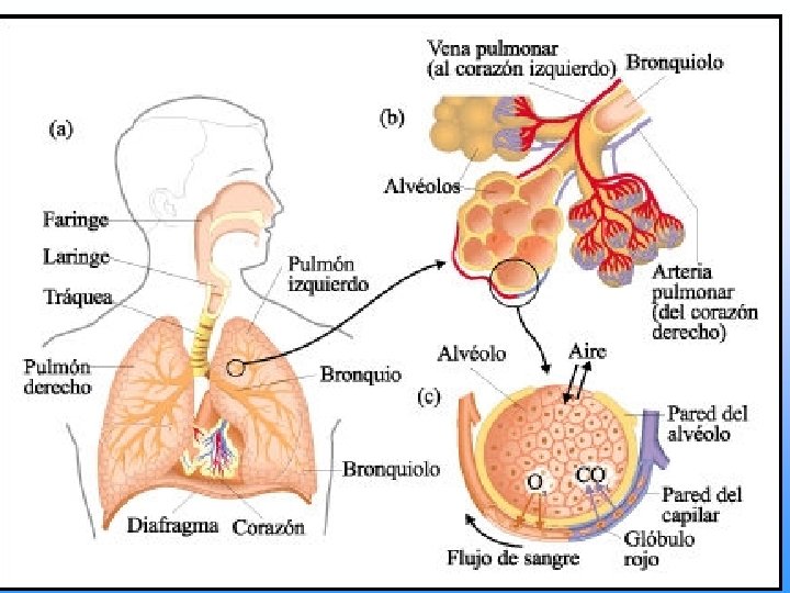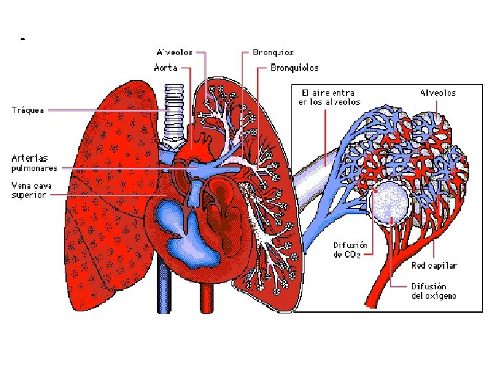 FASES DE LA RESPIRACION • Intercambio en los pulmones. – Inspiración el aire penetra en los pulmones, porque estos se hinchan al aumentar el volumen de la caja torácica. – En la Espiración el aire es arrojado al exterior ya que los pulmones se comprimen al disminuir de tamaño la caja torácica , pues el diafragma y las costillas vuelven a su posición normal.