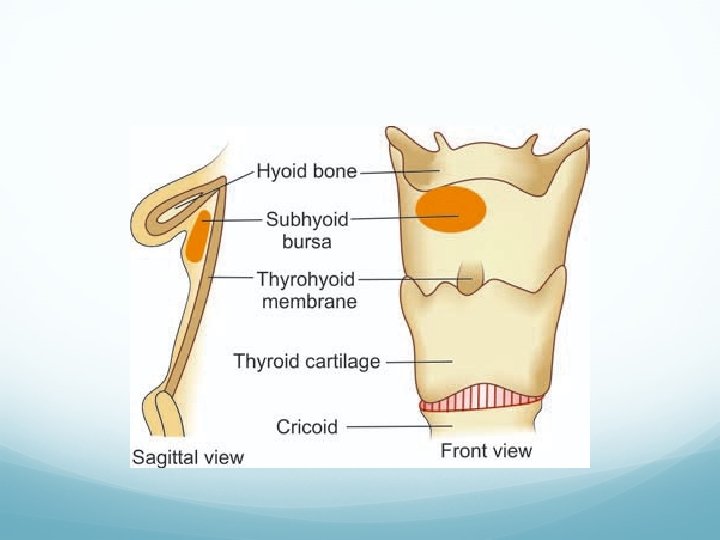 SUBHYOID BURSITIS Subhyoid bursa is space between posterior surface of the body of hyoid bone and thyrohyoid membrane. It lessens friction between these two structures during swallowing. Due to constant friction inflammatory fluid collects in the bursa leading to bursitis, which presents like a horizontally placed midline swelling between lower part of the hyoid bone and thyrohyoid membrane.