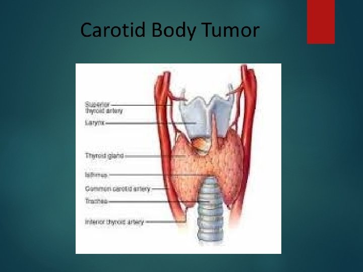 Carotid Body Tumor (para-ganglionoma) BENIGN TUMOR ARISES FROM EXTRA-ADRENAL CHROMAFFIN CELLS IN PARA-SYMP. GANGLIA CLINICAL FEATURES: MOBILE SIDE TO SIDE BUT NOT VERTICALLY ( FONTAINE’S SIGN) HIGHLY VASCULAR: PULSATILE & BRUIT DX: SUGGESTED BY US & CONFIRMATION BY MRA /CAROTID ANGIOGRAM TTT: SURGICAL EXCISION