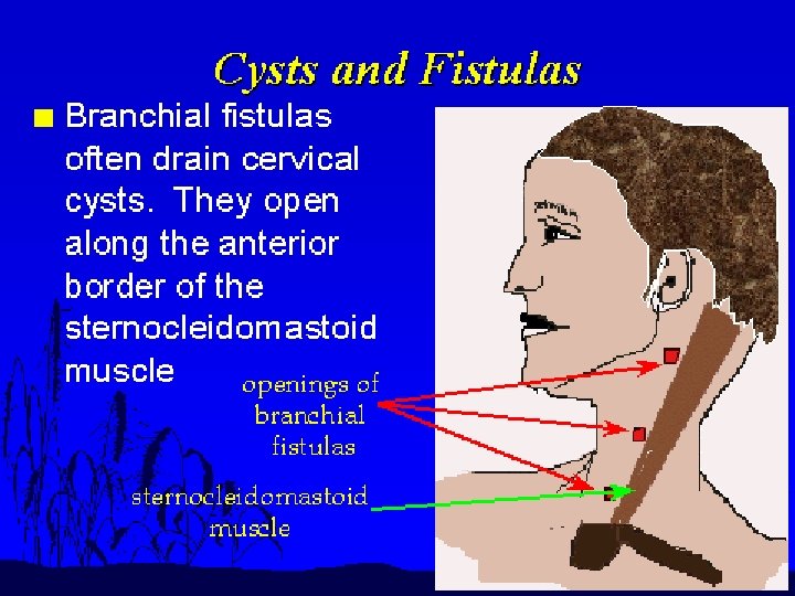S/S � � � A branchial cyst commonly presents as a solitary, painless mass in the neck of a child or a young adult. A history of intermittent swelling and tenderness of the lesion during upper respiratory tract infection may exist. Discharge may be reported if the lesion is associated with a sinus tract. In some instances, patients may present with locally compressive symptoms. A family history may be present. Branchial cysts are smooth, nontender, fluctuant masses, which occur along the lower one third of the anteromedial border of the sternocleidomastoid muscle between the muscle and the overlying skin. The lesion may be tender if secondarily inflamed or infected. When associated with a sinus tract, mucoid or purulent discharge onto the skin or into the pharynx may be present.