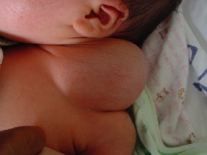 CHs often present after a sudden increase in size secondary to infection or intralesional bleeding. Spontaneous decompression or shrinkage is uncommon. � Rarely, children with CH display symptoms of newly onset obstructive sleep apnea syndrome (OSAS). This situation may involve children with CH or other space-occupying lesions of the supraglottis or paraglottic region. Suprahyoid lymphangiomas tend to cause more breathing difficulties than infrahyoid lesions. � Potentially life-threatening airway compromise that manifests as noisy breathing (stridor) and cyanosis is a possible symptom of lymphangiomas. � Feeding difficulties, as well as failure to thrive, may alert the clinician to a potential lymphangioma. This is especially true when the lesion affects structures of the upper aerodigestive tract. �
