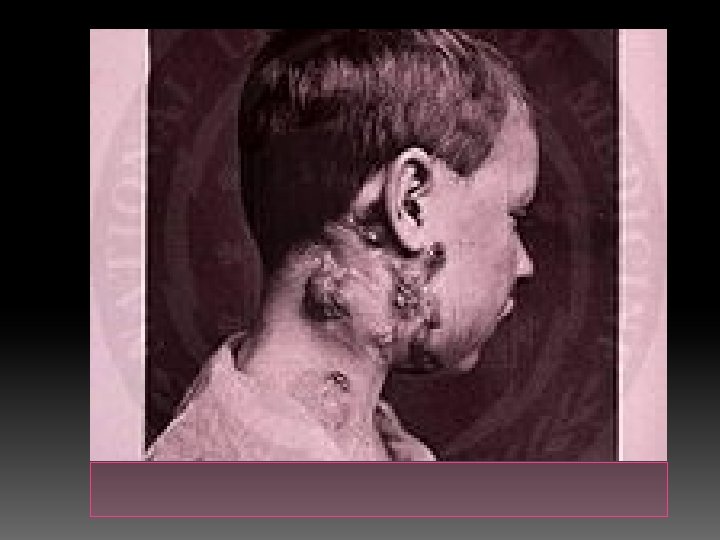 The most usual signs and symptoms are the appearance of a chronic, painless mass in the neck, which is persistent and usually grows with time. � The mass is referred to as a "cold abscess", because there is no accompanying local color or warmth and the overlying skin acquires a violaceous (bluish-purple) color. � NTM infections do not show other notable constitutional symptoms, but scrofula caused by tuberculosis is usually accompanied by other symptoms of the disease, such as fever, chills, malaise and weight loss in about 43% of the patients. � As the lesion progresses, skin becomes adhered to the mass and may rupture, forming a sinus and an open wound. �