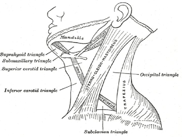 Level V This refers to the lymph nodes located in the posterior triangle of the neck. These include the spinal accessory, transverse cervical, and supraclavicular group of nodes. � Level V is bound anteriorly by the posterior border of the sternocleidomastoid muscle and posteriorly by the anterior border of the trapezius muscle. � Level V extends from the apex of the convergence of the sternocleidomastoid and trapezius muscle superiorly to the clavicle inferiorly. This level is subdivided by a plane defined by the inferior border of the cricoid cartilage into level Va superiorly and level Vb inferiorly. � Level. Va contains the nodes associated with the spinal accessory nerve, and level Vb contains the transverse cervical and supraclavicular nodes. � The posterior triangle nodes are at greatest risk for harboring metastasis from cancers that arise in the nasopharynx, oropharynx, and skin of the posterior scalp and neck �
