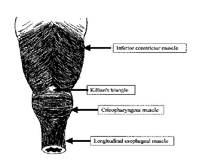 Zenker diverticula occur in a muscular dehiscence that is present most commonly between the oblique muscle fibers of the inferior constrictor muscle and the transverse fibers of the cricopharyngeus (CP) muscle. This area is known as the Killian triangle. � Other areas of muscular dehiscence occur between the oblique and transverse fibers of the CP muscle (ie, Killian-Jamieson area) and between the CP muscle and the esophageal muscles (ie, Laimer triangle). � More inferiorly positioned Zenker diverticula may occur in one of these latter sites �