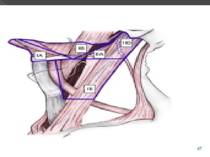 Level I This level is bound by the body of the mandible superiorly, stylohyoid muscle posteriorly, and the anterior belly of the digastric muscle on the contralateral side anteriorly. � This level may be divided into level Ia, which refers to the nodes in the submental triangle (bound by the anterior bellies of the digastric muscles and the hyoid bone), and Ib, which refers to the submandibular triangle nodes. � The nodes of level Ia are at greatest risk of harboring metastasis from cancers that arise from the floor of mouth, anterior tongue, anterior mandibular alveolar ridge, and lower lip, while the nodes of level Ib often receive metastasis from cancers of the oral cavity, anterior nasal cavity, soft tissue structures of the mid face, and submandibular gland. � Closely related, although not strictly a part of the level I group of nodes, are the perifacial nodes, related to the facial vessels above the mandibular margin, and the buccinator nodes, which may become involved with metastasis from tumors in the buccal mucosa, nose, and soft tissues of the cheek and lips. �