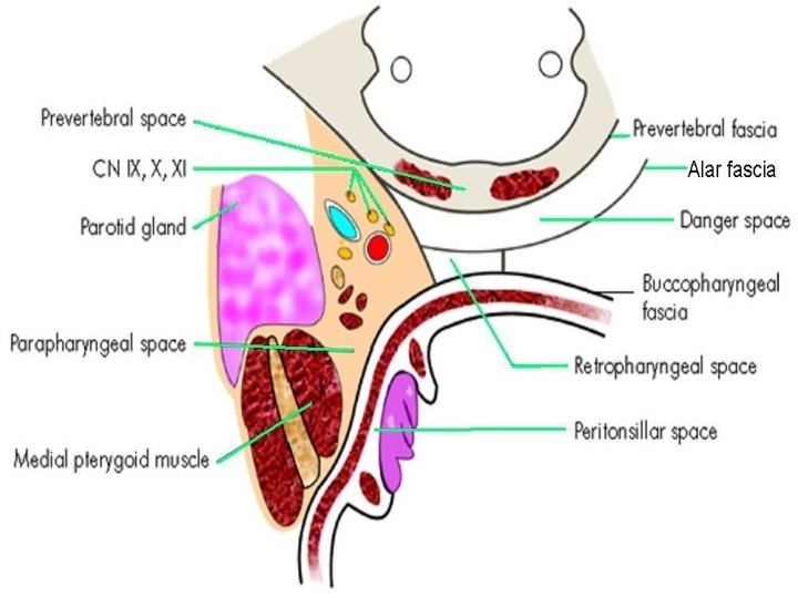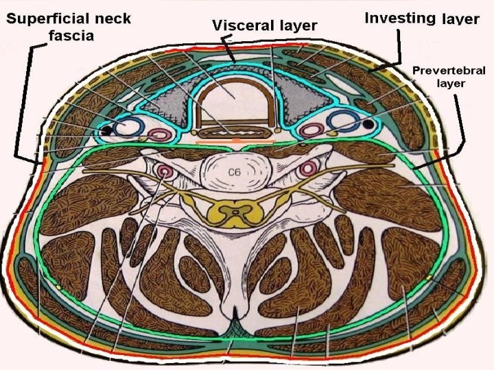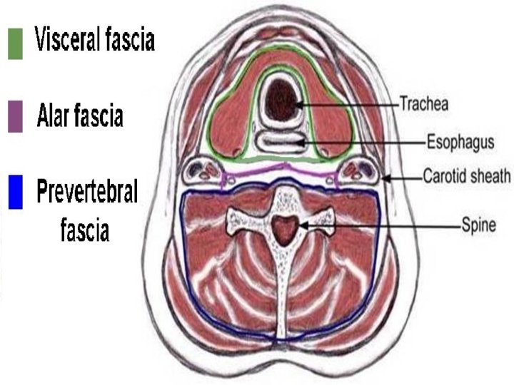 Fascial layers of neck A. Superficial cervical fascia: encloses platysma B. Deep cervical fascia 1. Superficial or Investing layer 2. Middle layer 3. Deep layer a. Muscular division a. Alar fascia b. Visceral division b. Pre-vertebral fascia