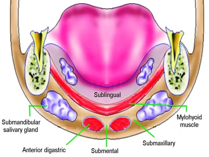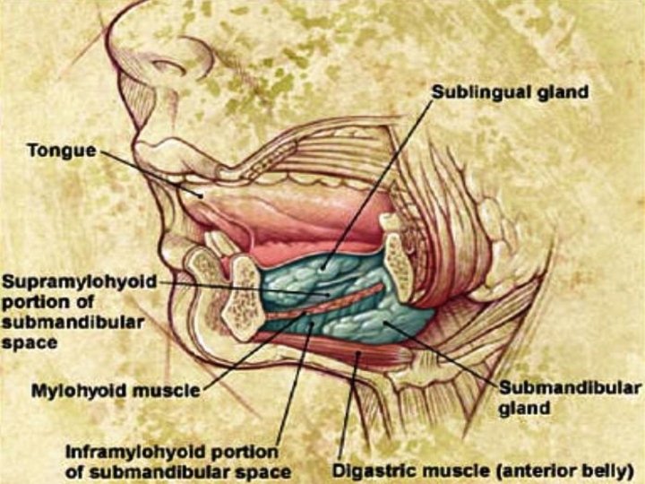 Submandibular space Boundaries: Anterior & lateral: mandible Medial: anterior belly of digastric Posterior: submandibular gland Inferior: level of hyoid bone Subdivisions: 1. Sublingual space: above mylohyoid muscle 2. Submaxillary space: below mylohyoid muscle Contents: Submandibular salivary gland, lymph nodes
