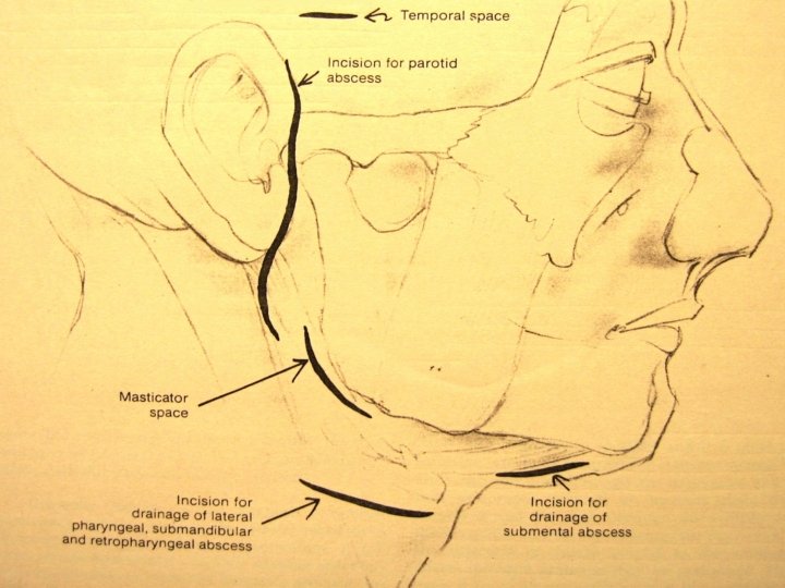 Treatment 1. IV fluid for dehydration 2. IV Ampicillin + Gentamicin + Metronidazole 3. Incision drainage: a. Blair’s incision made b. Multiple incisions made through fascia, parallel to facial nerve branches c. Blunt dissection to evacuate pus. Drains placed.