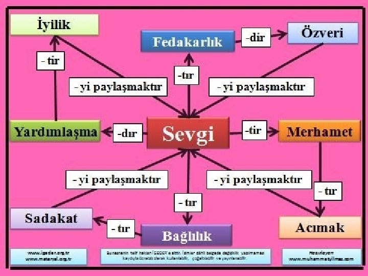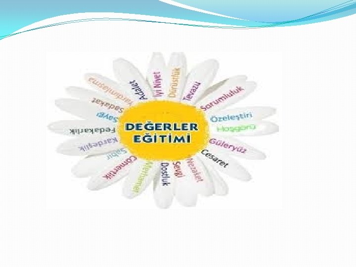 • UNUTMAYALIM… • Değerler öğretilebilen ve öğrenilebilen olgulardır. Değerler sadece okunarak ya da dinlenerek öğrenilemez. Çünkü değerler duyuşsal alan kapsamındadır. • Değerlerin kazanımı için yaşantıya, empatiye, modellemeye, problem çözmeye, buluşa dönük etkinlikler hazırlanmalıdır. • Değer kazanımına yönelik etkinliklerde öğretmen daima “Olumlu davranışları, sözleri pekiştirmek/takdir etmek gerekir. ” ilkesiyle hareket etmelidir.