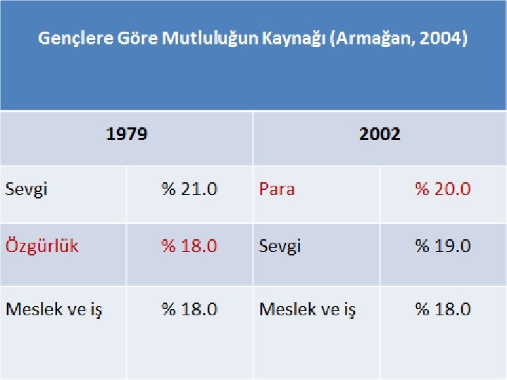 Güç ve zenginlik mutluluk getirir mi? § Modern hayat yaşam standartlarını yükseltti. § İnsanlar daha zengin, daha bilgili, ama daha rahat değiller. § Depresyon ve kaygı başta olmak üzere psikolojik rahatsızlıklar yükseldi. § Mutsuzluk oranları yükseldi, intiharlar arttı. § Aile kurumu can çekişiyor. § Hem suç çeşitleri hem de suçluluk oranı sürekli artıyor.