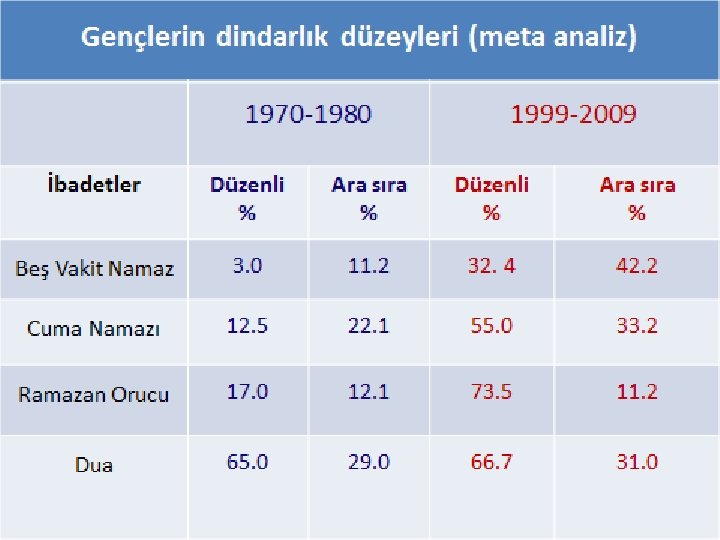 Din, Kültür ve Değerler 1 Felsefi akımların ve seküler paradigmaların etkisi ile kültür ve dini sorgulama 2 Doğru dinî bilgiye ulaşmada yaşanan sorunlar 3 Kültür, din ve değerlerde neyin doğru neyin yanlış olduğunu ayırt edememe 4 Kurumsal dindarlıkta göreceli artışın ahlakî yaşayışa yansımaması 5 Geleneksellik ile modernite arasındaki çatışmalar: Kültürel Şizofreni - Yaralı Bilinç 6 Kapitalist bir dünya görüşünü benimseme: Bencillik ve hazcılık da artış