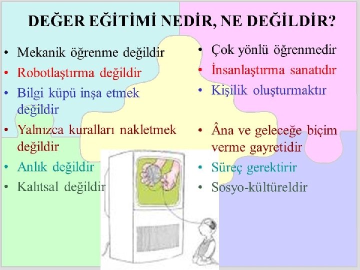 Niçin Değerler Eğitimi? �Asıl amaç sadece evrensel değerlerle dünyadaki yerimizi alırken, yerel ve kültürel değerlerle bizi başkalarından farklılaştıran kimlik hatlarının korunmasıdır. �Küreselleşmenin kültürü ve kimliği tahrip edici gücü karşısında direnmeye çalışmak. �Subliminal etkiler, medya ve görsel şovlar ile tüketim toplumunun ve hazcılığın özendirilmesi, olma değil sadece sahip olma arzusu ile yaşamanın «hayatın olmazsa olmazı haline getirilmesi» gibi olumsuz etki ve süreçlerden korunabilmek.