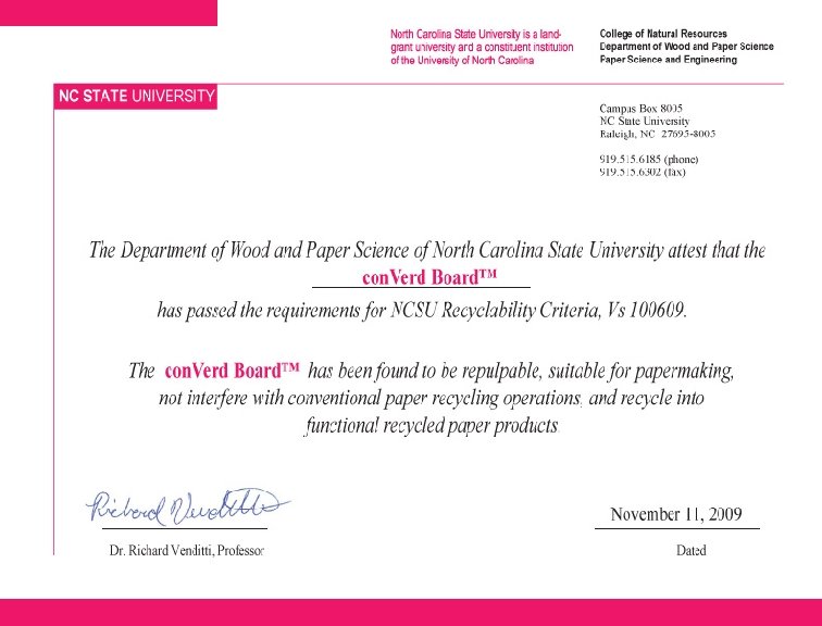 con. Verd Board® Rigid, Paper-based, environmental alternative for signage, displays and POP. Used for Indoor POP, displays, hanging signage Available in 6 calipers Recycled, FSC Certified and Recyclable!