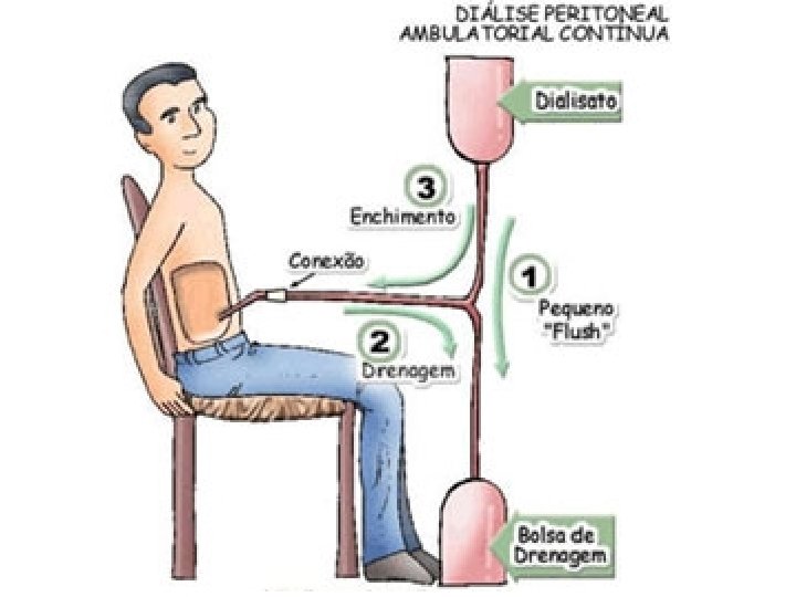 Tipos de Diálise Peritoneal • Diálise Peritoneal Ambulatorial Continua (CAPD): realizada diariamente e de forma manual pelo paciente e/ou familiar; 4 trocas ao dia (manhã, almoço, tarde, noite) de aproximadamente 30 minutos. No período entre as trocas, o paciente fica livre das bolsas. Uma vez por mês o paciente vai ao hospital ou à clínica para colher exames de sangue, urina e fazer a consulta com o médico nefrologista.